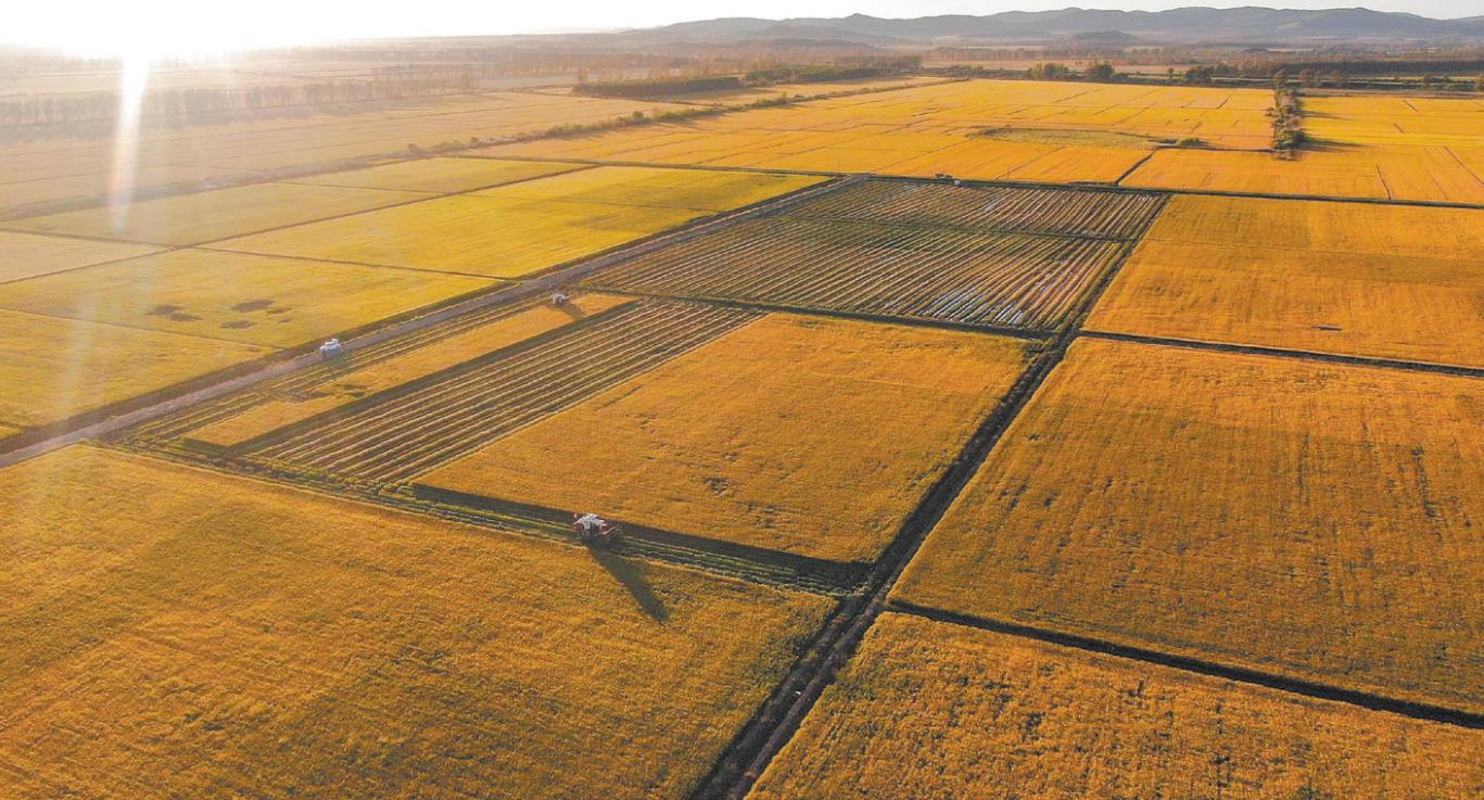 9月10日,在北大荒集團(tuán)黑龍江共青農(nóng)場有限公司河北莊管理區(qū)水稻地塊,農(nóng)機(jī)手駕駛割曬機(jī)進(jìn)行割曬作業(yè)(無人機(jī)照片)。