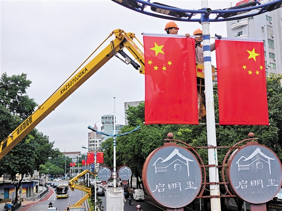 ????記者昨日在躍進(jìn)路、啟明里、蓬江大橋一帶見到,城管部門工作人員正開著幾輛路燈工作車,給路燈桿懸掛國(guó)旗,很快,街頭上一面面鮮艷的五星紅旗迎風(fēng)招展。