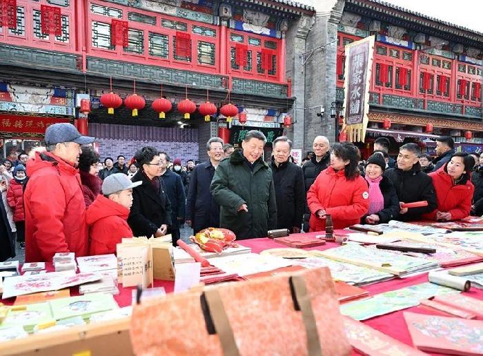 2024年2月1日,習近平總書記在天津古文化街考察時,同店鋪員工和現(xiàn)場群眾互動交流。