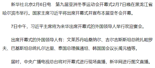 習(xí)近平將出席哈爾濱第九屆亞洲冬季運動會開幕式并舉行外事活動