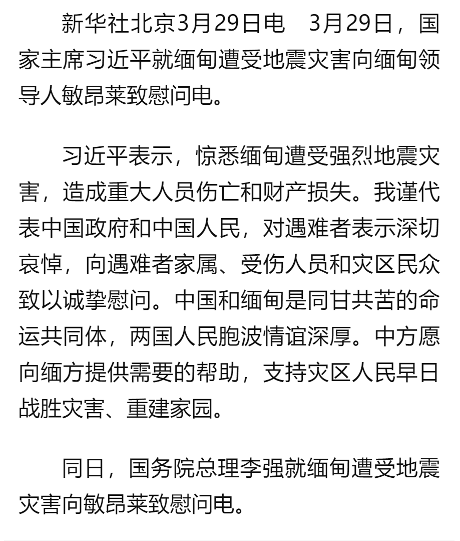習(xí)近平就緬甸遭受地震災(zāi)害向緬甸領(lǐng)導(dǎo)人敏昂萊致慰問電