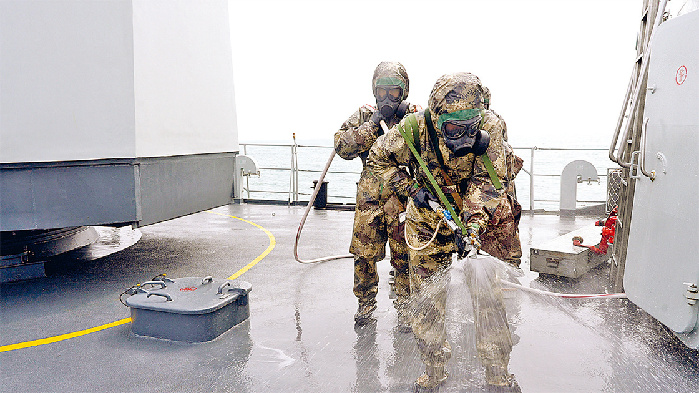 茫茫大海,就是錘煉作戰(zhàn)利劍的“淬火池”?!扒胺胶S虬l(fā)現(xiàn)異常煙霧,防化學(xué)武器部署!”機(jī)動(dòng)途中,新的“敵情”傳來,編隊(duì)艦艇開啟全艦水幕系統(tǒng),官兵快速穿戴防護(hù)裝具,投入新一輪訓(xùn)練……