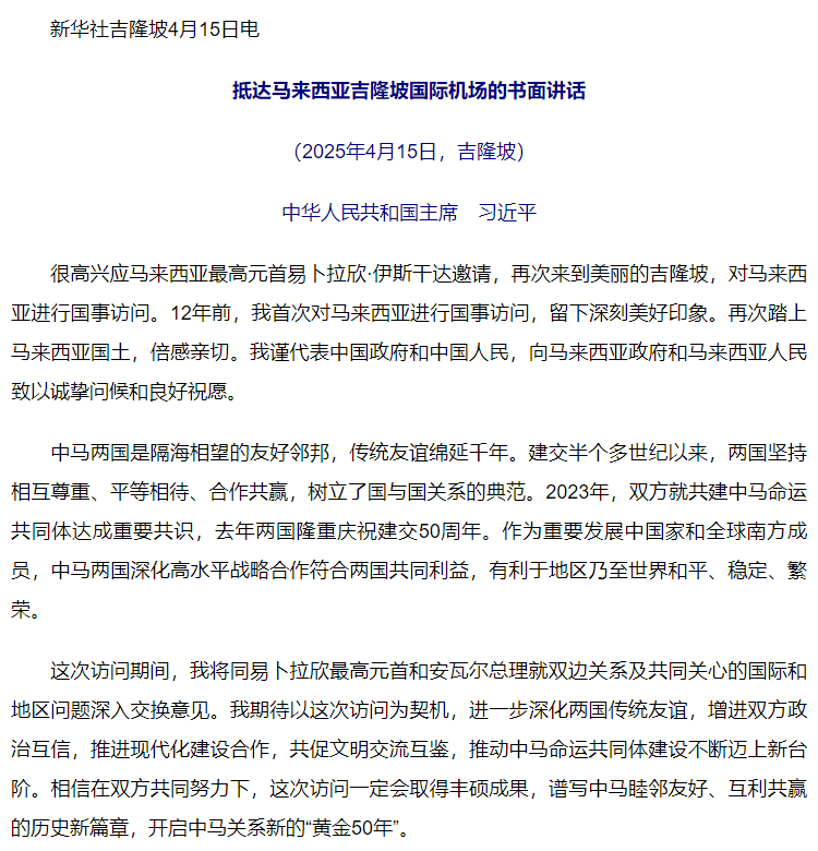 習(xí)近平抵達(dá)馬來西亞吉隆坡國際機(jī)場發(fā)表書面講話