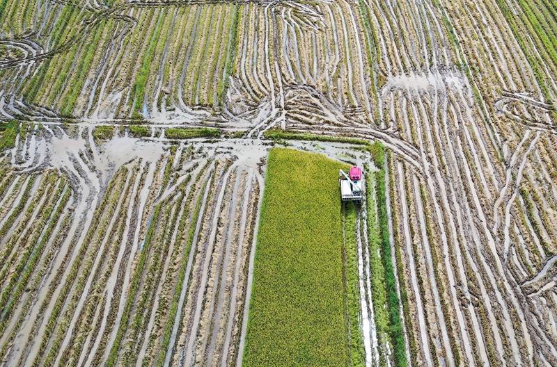 ??△2025年5月,海南??谠讫堟?zhèn)三十六曲溪兩岸的早稻進入夏收時節(jié)。