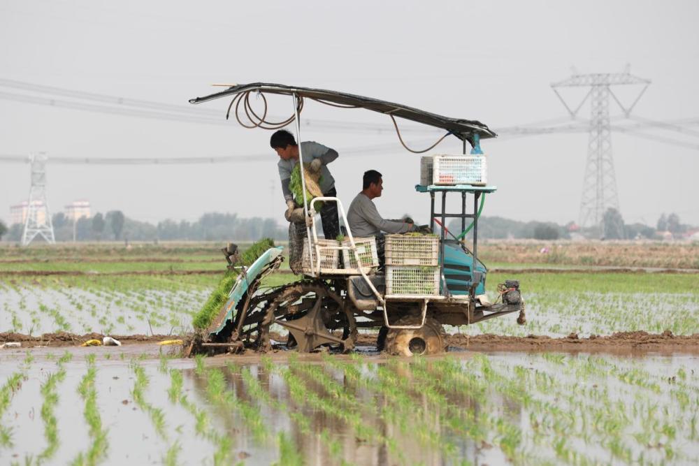 ??△2025年5月,農(nóng)民在河北滄縣南堤村的鹽堿稻田進行插秧作業(yè)。