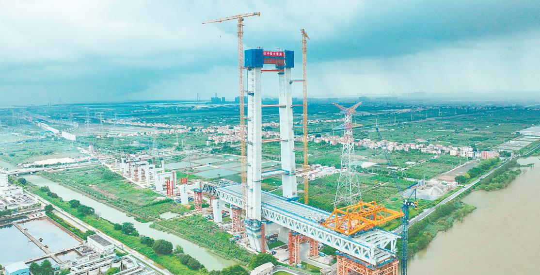 ????新建深江高鐵正線全長(zhǎng)約116公里,其中中鐵大橋局承建的8標(biāo)段洪奇瀝水道公鐵合建段主橋長(zhǎng)1.41公里,主跨808米,采用世界首創(chuàng)的公鐵合建超短邊跨鋼混箱桁組合梁體系,是全線關(guān)鍵控制性工程。大橋上層為八車道城市快速公路,下層為四線高速鐵路。