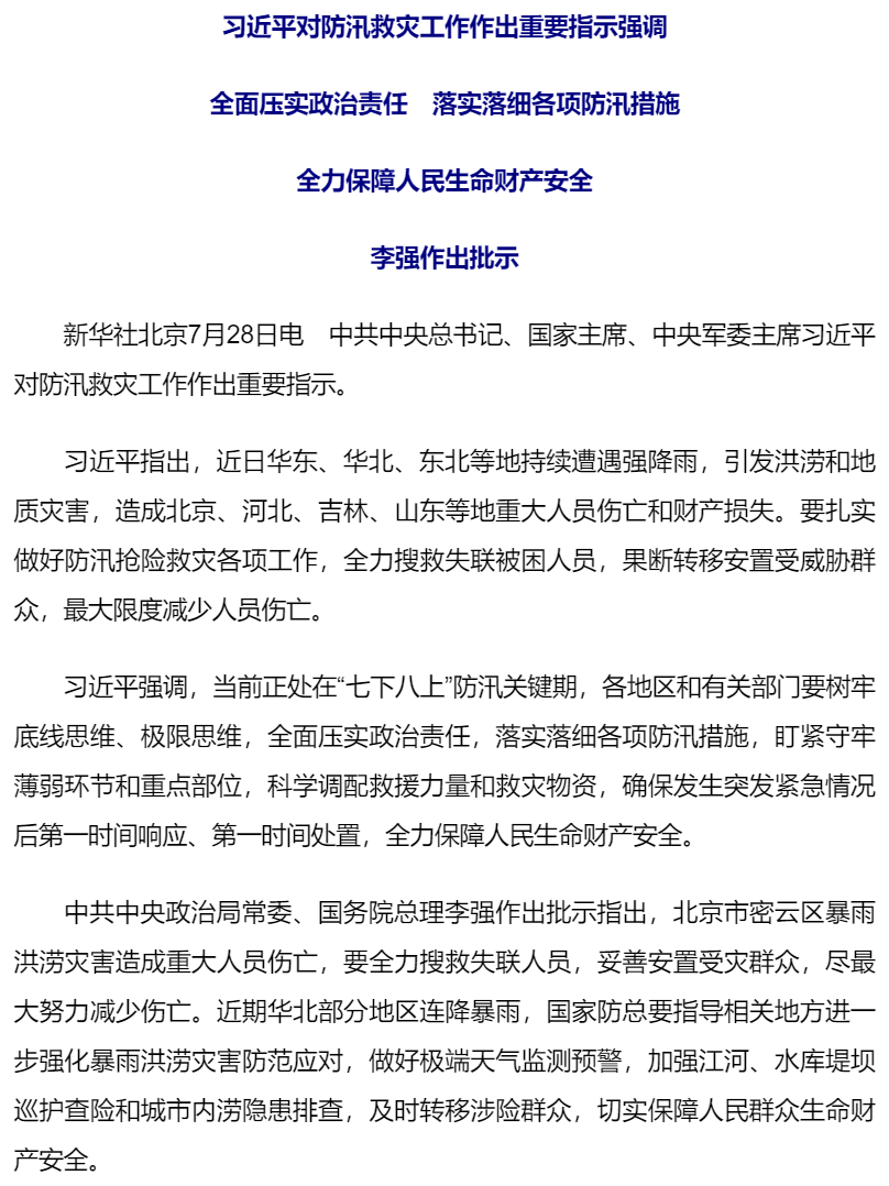 習(xí)近平對(duì)防汛救災(zāi)工作作出重要指示
