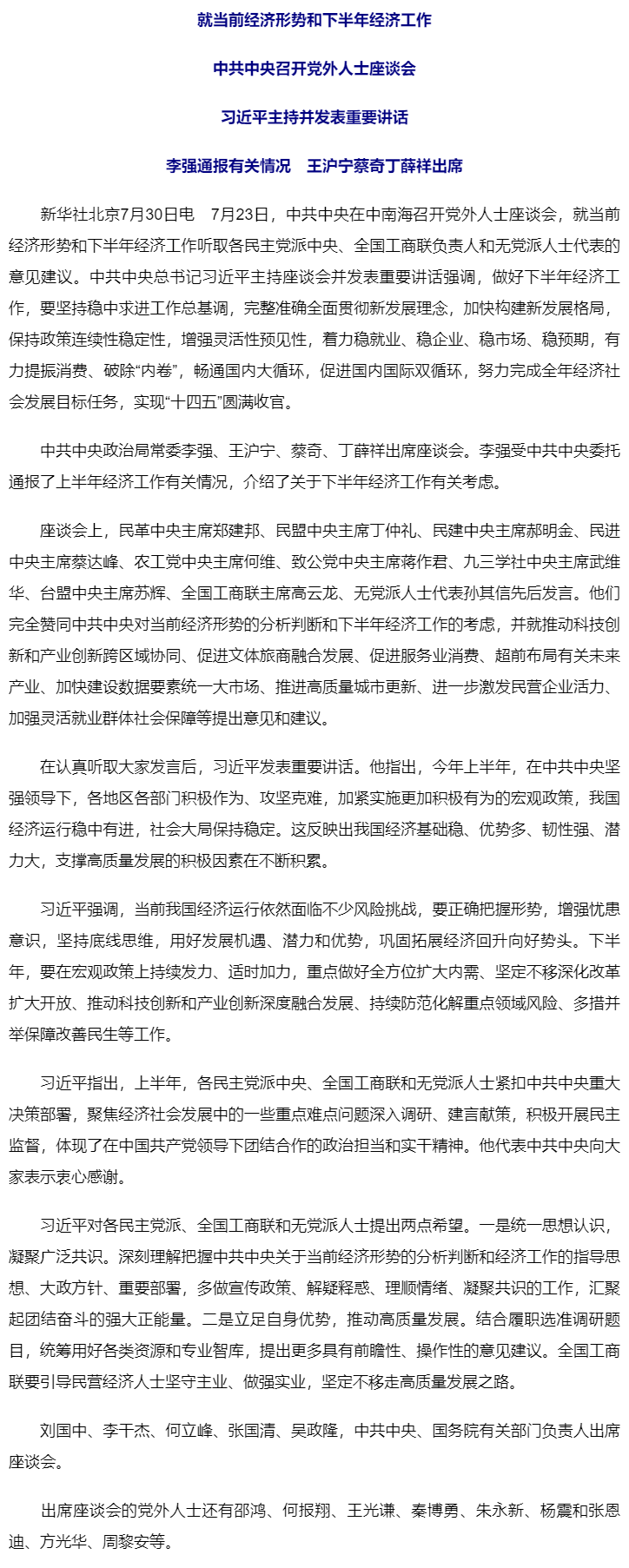 就當前經(jīng)濟形勢和下半年經(jīng)濟工作 中共中央召開黨外人士座談會 習近平主持并發(fā)表重要講話