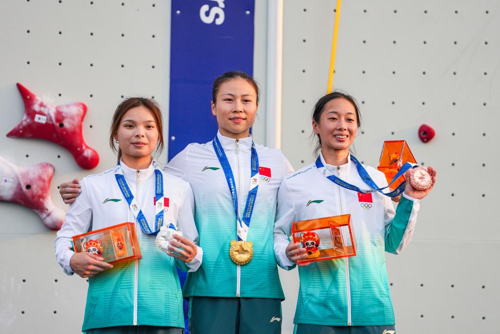 8月14日,2025年成都世運會攀巖女子速度個人賽中,中國選手包攬獎牌。圖為鄧麗娟(中)、覃于妹(左)和周婭菲在頒獎儀式上合影。新華社記者 丁增尼達(dá) 攝