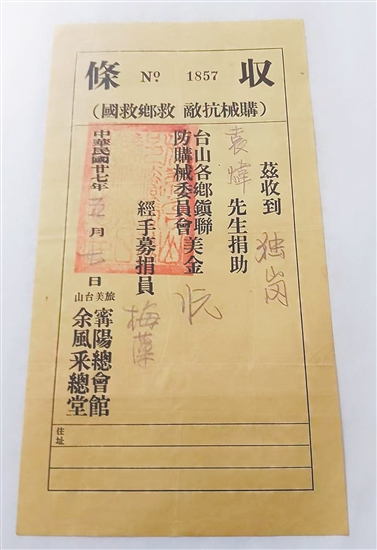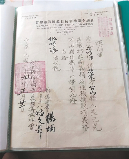 ????據(jù)統(tǒng)計,李春榮累計捐贈史料達(dá)214件(份),其中不乏極具歷史價值的華僑捐款憑證,包括《紐約全體華僑抗日救國籌餉總會證明書》《華僑拒日救國后援總會捐款收條》《旅美臺山寧陽總會館、余風(fēng)采總堂抗敵救鄉(xiāng)救國捐款收條》《墨西哥尾利打抗日救國后援會捐款收條》等。
