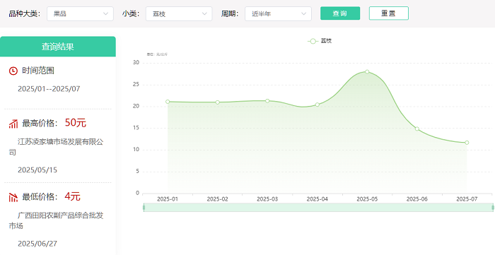今年荔枝迎來“大年”,廣東、廣西等主產(chǎn)地果園掛果量較往年增長超30%,全國產(chǎn)區(qū)普遍一片豐產(chǎn)景象。然而,隨著全國荔枝大量上市,荔枝平均價格出現(xiàn)逐步走低的跡象。據(jù)“中國農(nóng)業(yè)農(nóng)村信息網(wǎng)”公布的“全國農(nóng)產(chǎn)品批發(fā)市場價格行情”數(shù)據(jù)顯示,5月15日江蘇凌家塘市場最高價達(dá)50元/公斤,而6月27日廣西田陽市場最低價僅4元/公斤,荔枝全國價格波動明顯。
