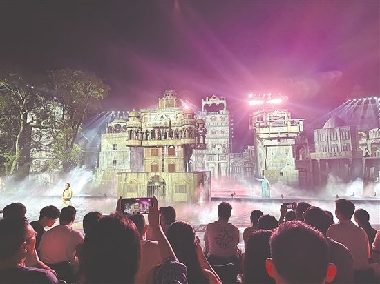 ????晚上8時30分,赤坎華僑古鎮(zhèn)的晚風裹著僑鄉(xiāng)煙火氣,人流循著燈光向水劇場聚攏。不過半小時,劇場內(nèi)5000余個座位便座無虛席,觀眾手中的手機鏡頭已悄悄對準舞臺——大家等候的,正是能讓開平碉樓故事“穿越時空”的《火秀》。