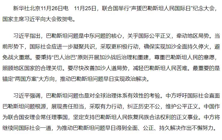 習近平向“聲援巴勒斯坦人民國際日”紀念大會致賀電