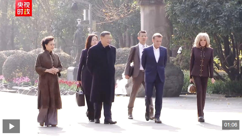 ??初冬的都江堰,蒼山掩翠。馬克龍夫婦抵達時,受到習(xí)近平和彭麗媛熱情迎接。兩國元首夫婦沿堰功道邊走邊談。習(xí)近平介紹都江堰歷史和意義,指出都江堰水利工程是全世界迄今唯一仍在使用的古代水利工程,也是人類與自然和諧共生最早的成功實踐之一,修建過程充分反映了中華民族自強不息、不畏艱難、勇于開拓的精神。兩國元首夫婦落座懷古亭,臨水品茗,縱論天下。