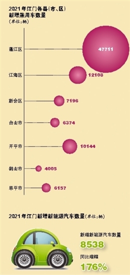 ????在去年江門(mén)車市成績(jī)亮眼的情況下,各縣(市、區(qū))貢獻(xiàn)如何?根據(jù)市稅務(wù)局提供的數(shù)據(jù)顯示,2021年,蓬江區(qū)新增乘用車47711輛,其次是江海區(qū)新增乘用車12108輛,接著是開(kāi)平市新增乘用車10144輛。新會(huì)區(qū)、臺(tái)山市、鶴山市、恩平市新增乘用車數(shù)量分別為7196輛、6374輛、4005輛、6157輛。