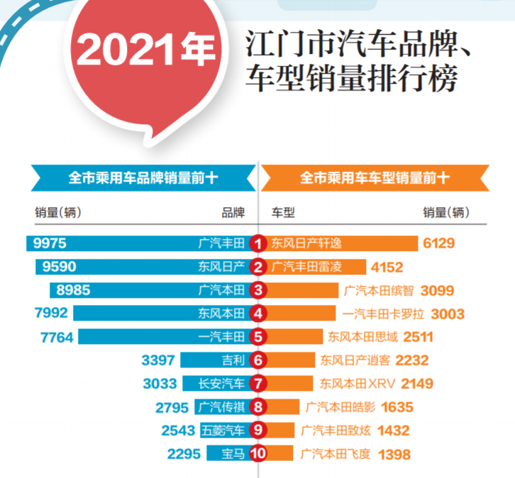 ????是哪一輛車的出現(xiàn),滿足了你對美好生活的期待?是哪一個品牌的扎根,打動了你原本平靜的心?買車雖好,但選車有講究。近日,本報從市稅務(wù)局獲取了2021年各汽車品牌、車型在江門地區(qū)的新增數(shù)據(jù),并進行統(tǒng)計分析,獨家發(fā)布2021年各大汽車品牌、車型在五邑地區(qū)的銷售數(shù)據(jù)(限乘用車),供廣大消費者參考。